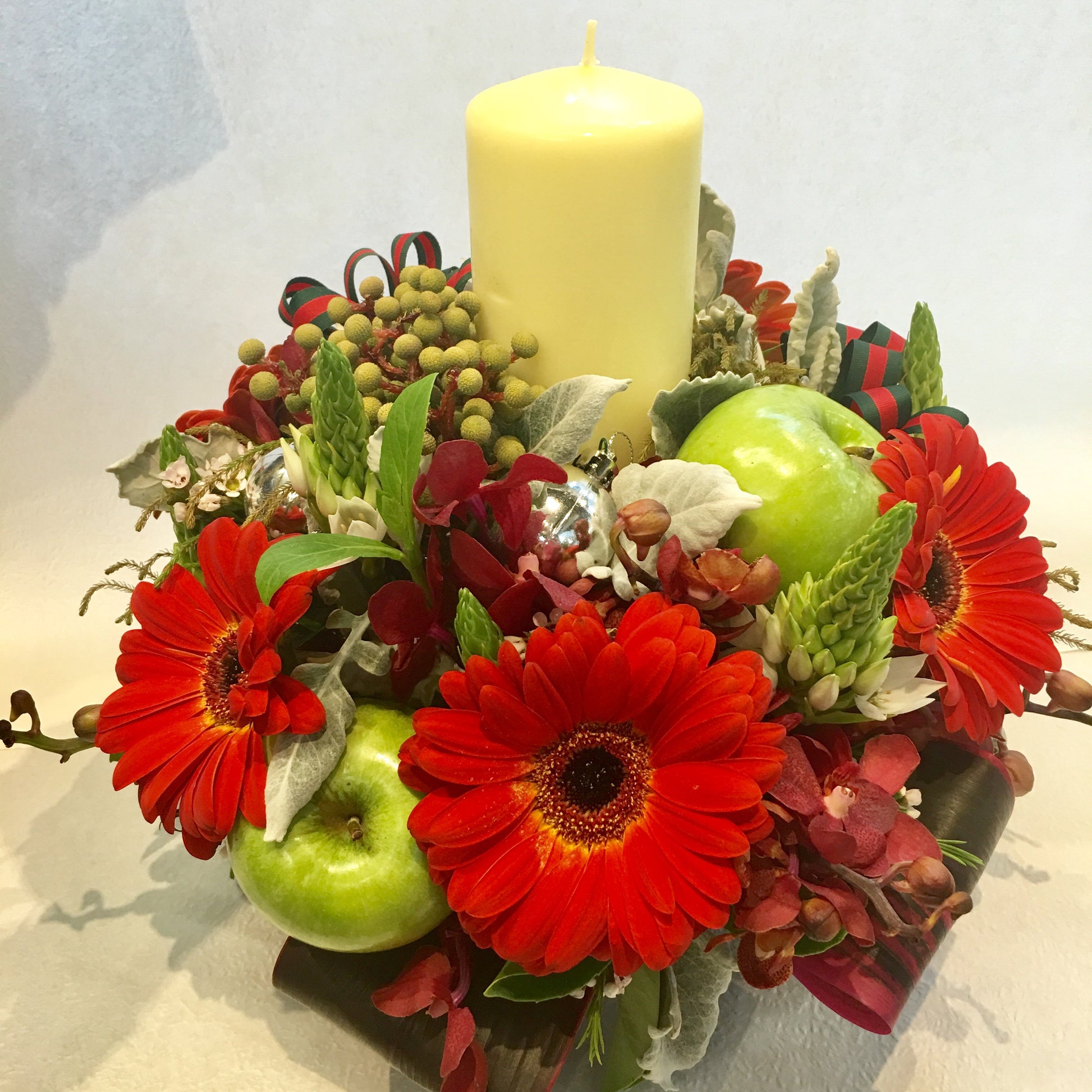 Red gerberas, berries, and candle
