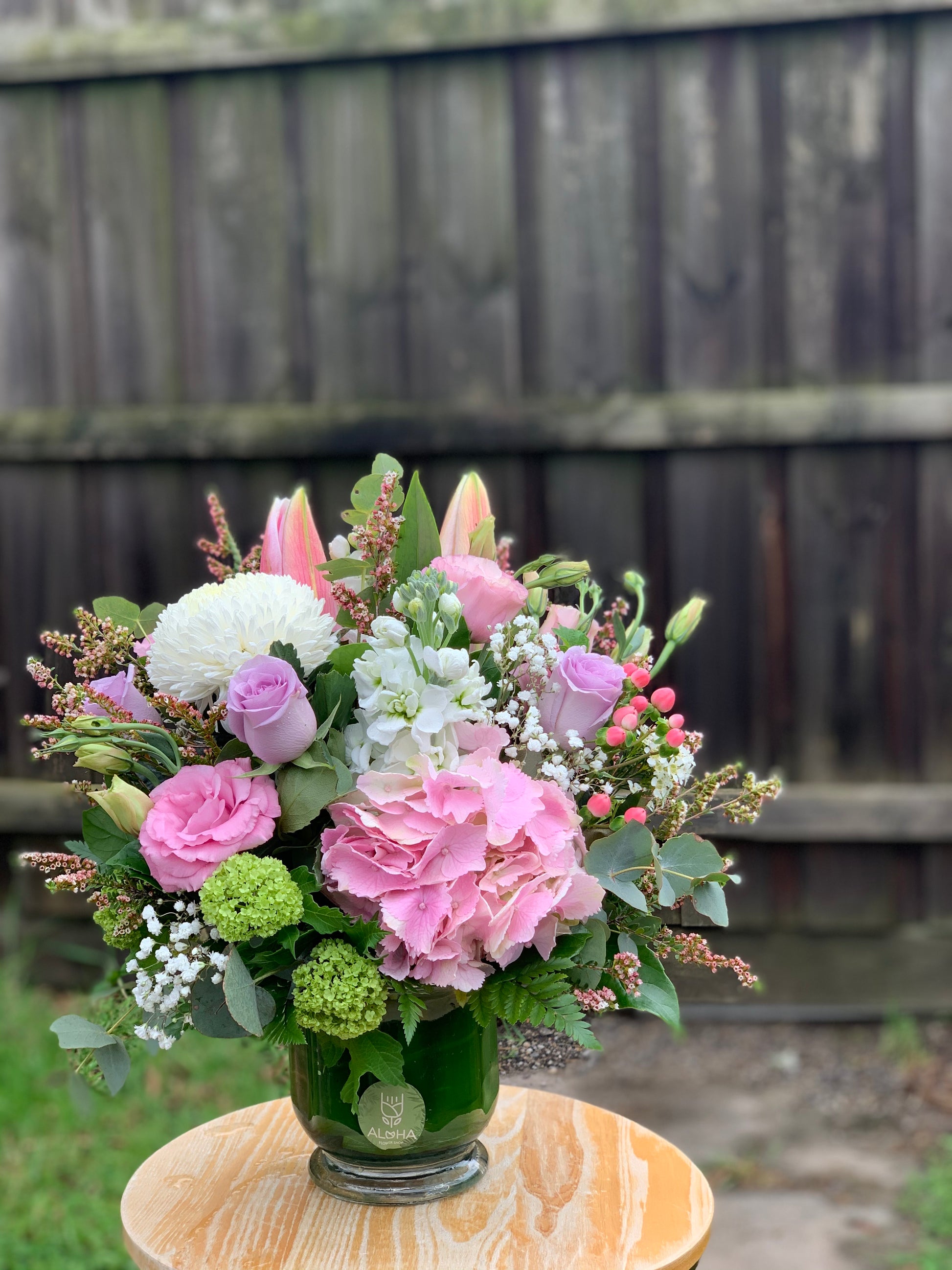 Baby breath, roses, lilies and lisianthus