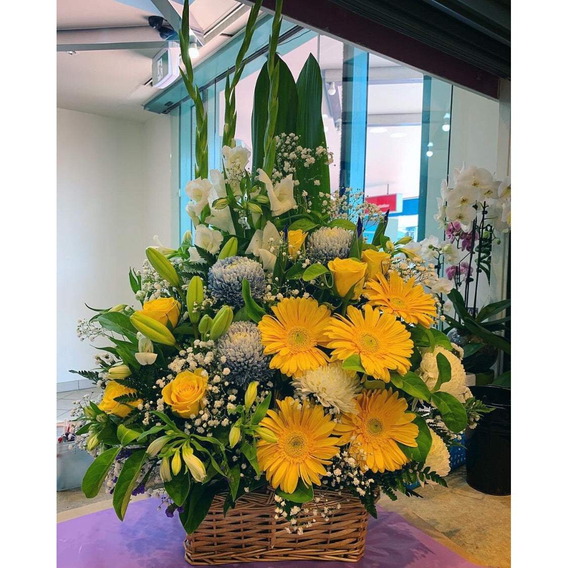 Yellow gerberas, yellow roses, , yellow lilies, blue disbuds, baby breath, gladis and astros in a basket