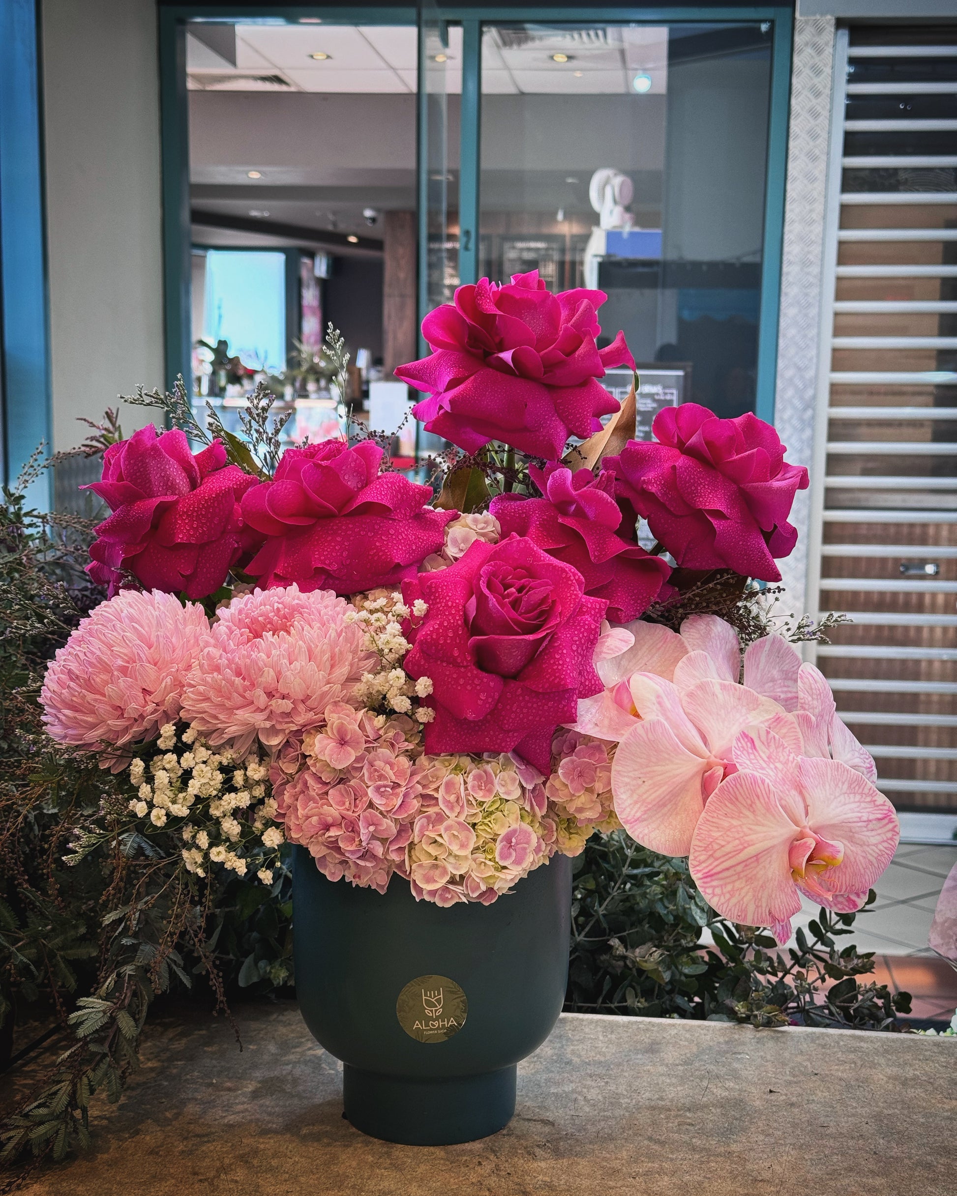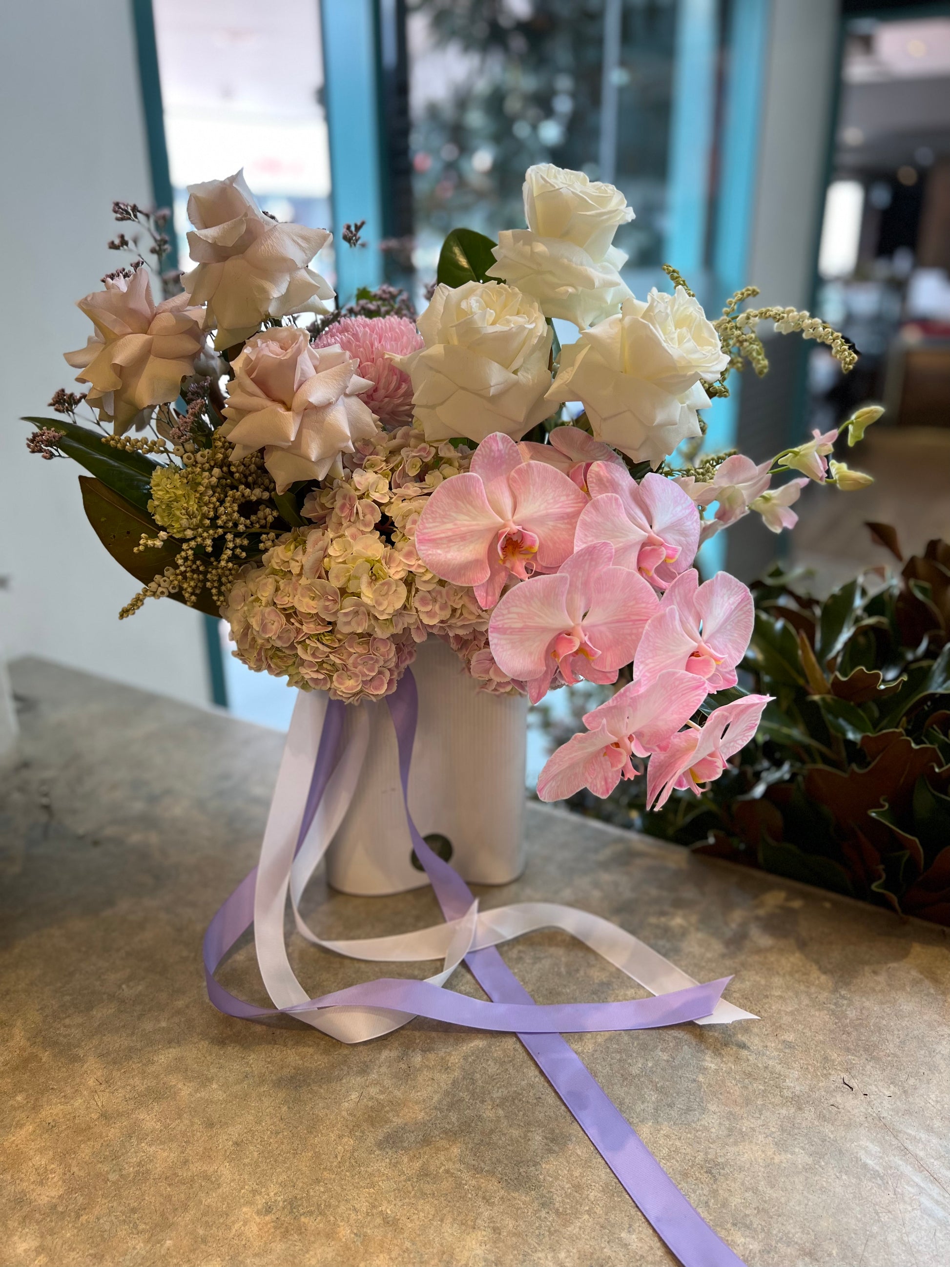 Modern Infinity Vase arrangement with reflexed roses, hydrangeas, 1 stem of phalaenopsis orchids and minimal greenery.