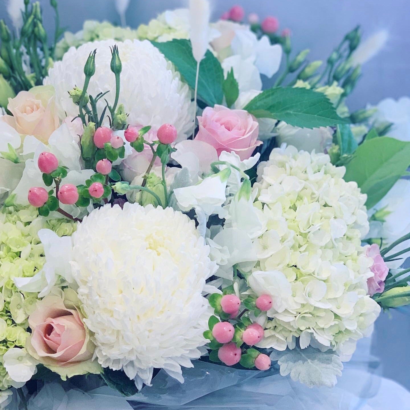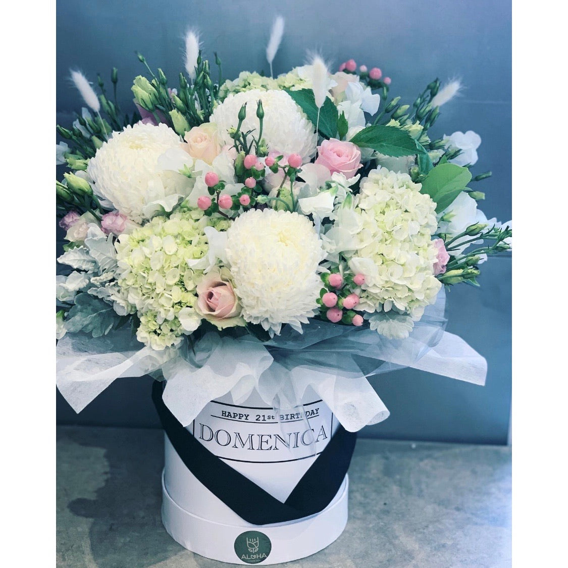 Disbuds, roses, hydrangeas, berries, lisianthus and greenery in a box