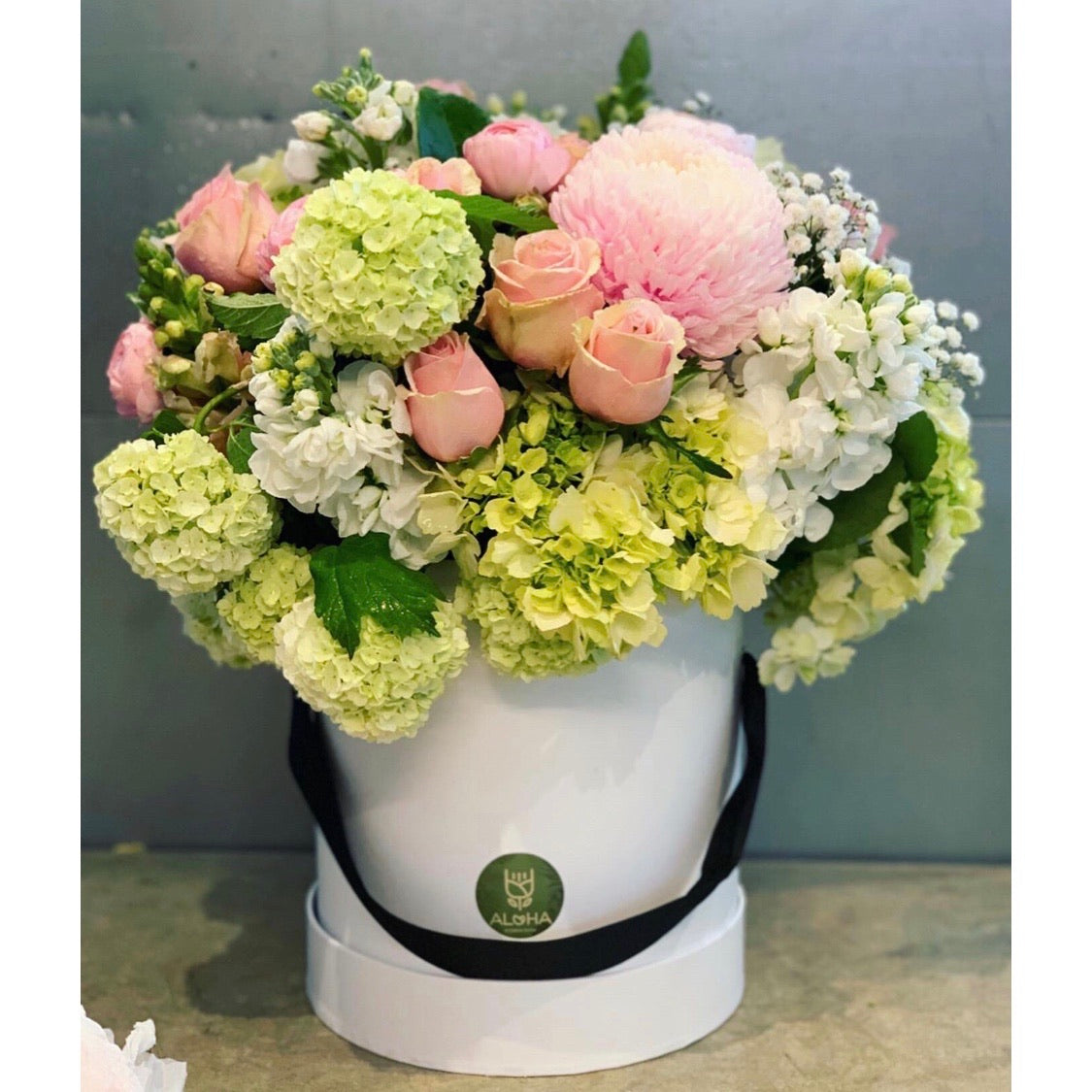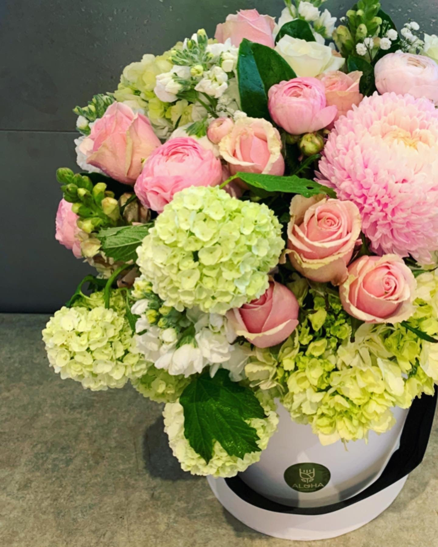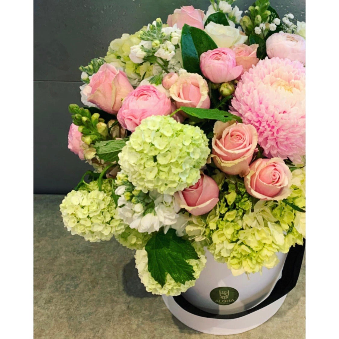 Selection of light pink and white flowers - disbuds, roses, hydrangeas.