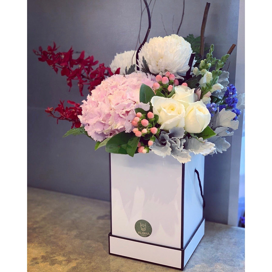 Peonies, roses, orchids, berries and hydrangeas in a box