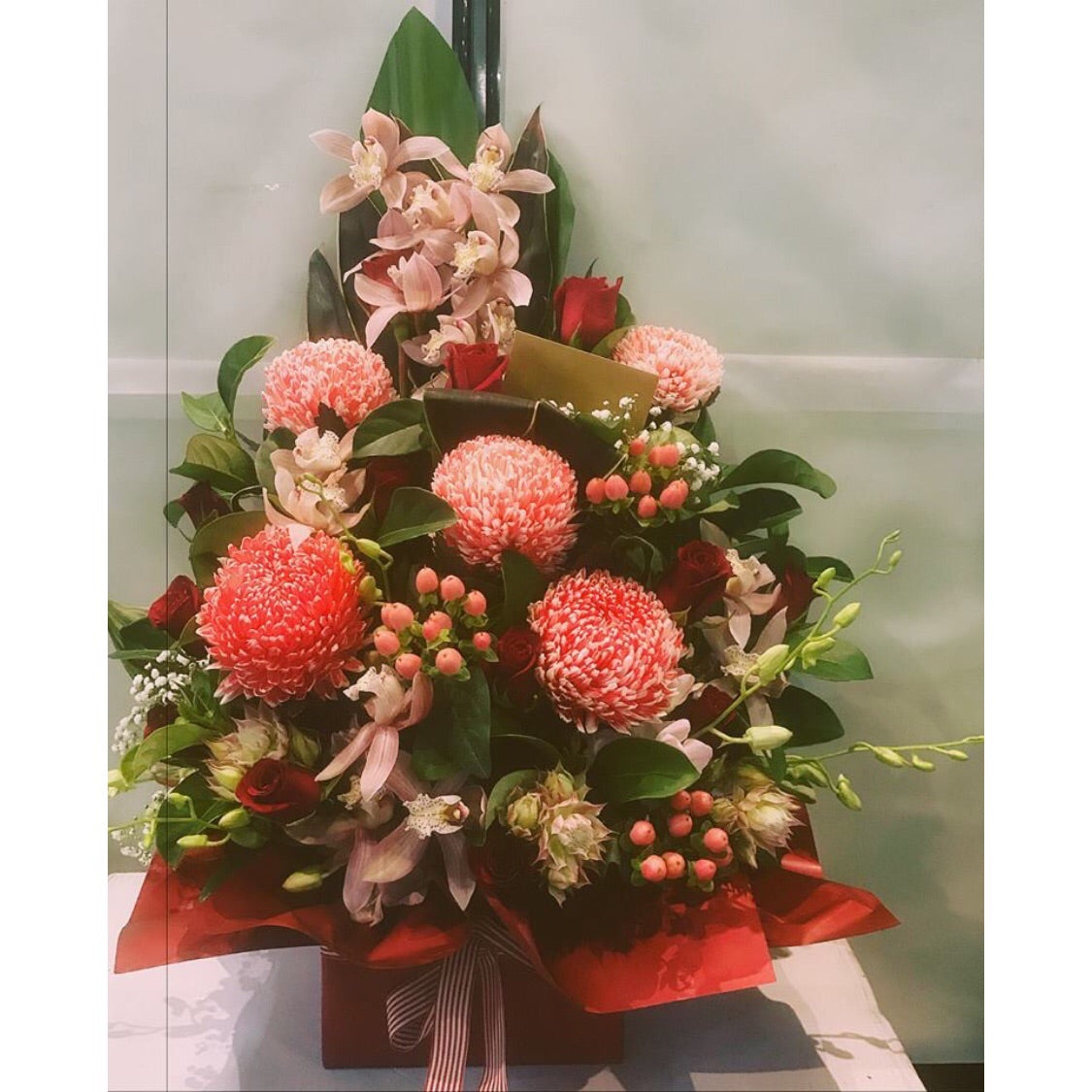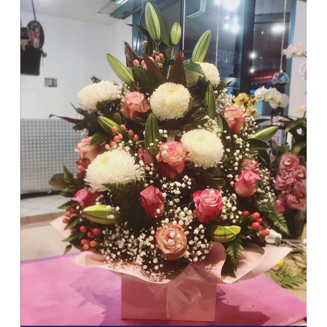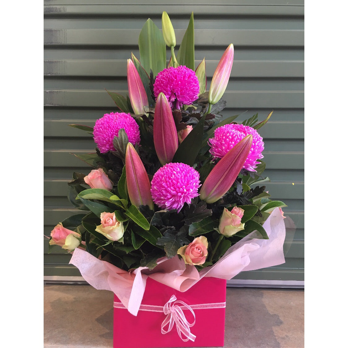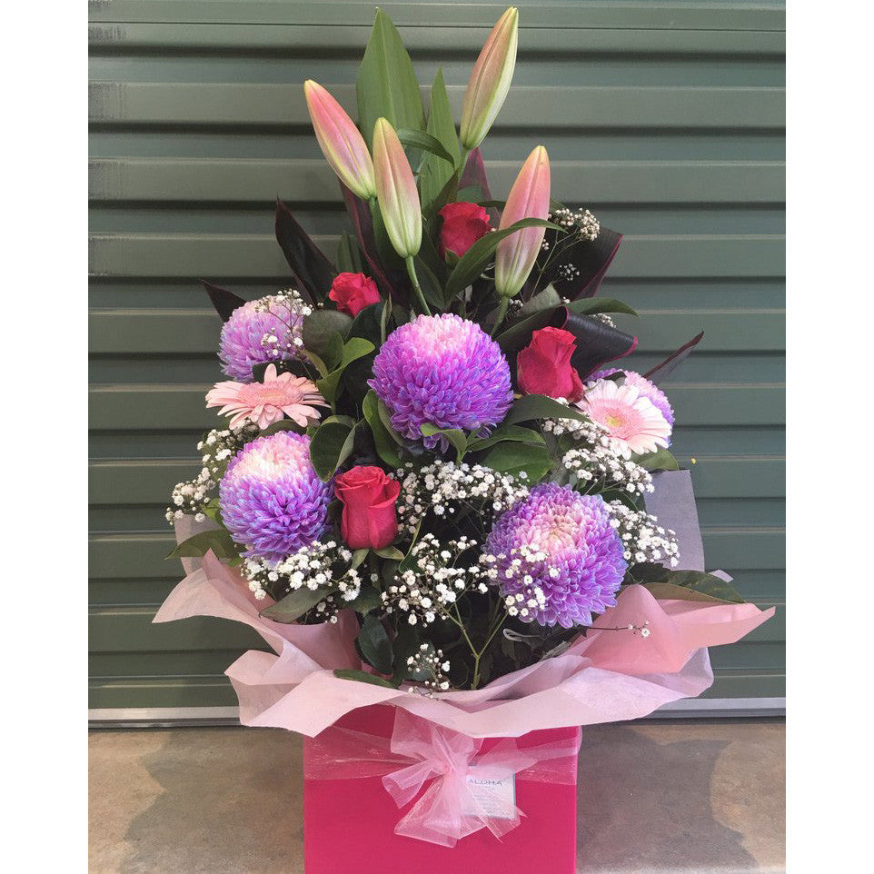 Oriental lilies, roses, mini gerberas, baby breath and disbuds or seasonal pink and purple flowers in a box
