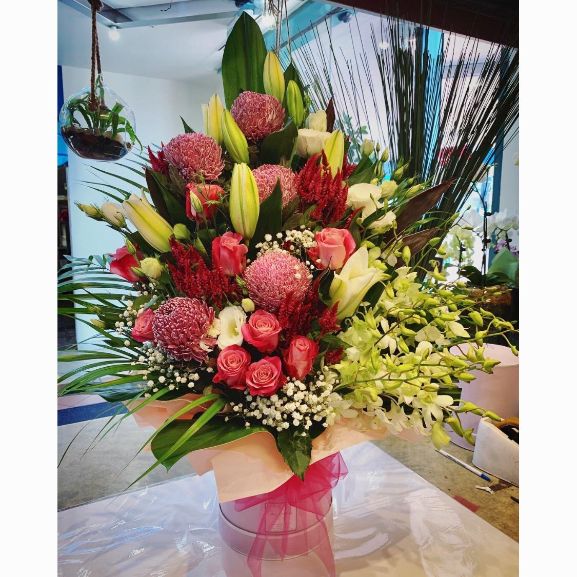 White Singapore orchids, chrysanthemums, disbuds, oriental lilies, roses and tropical leaves in box