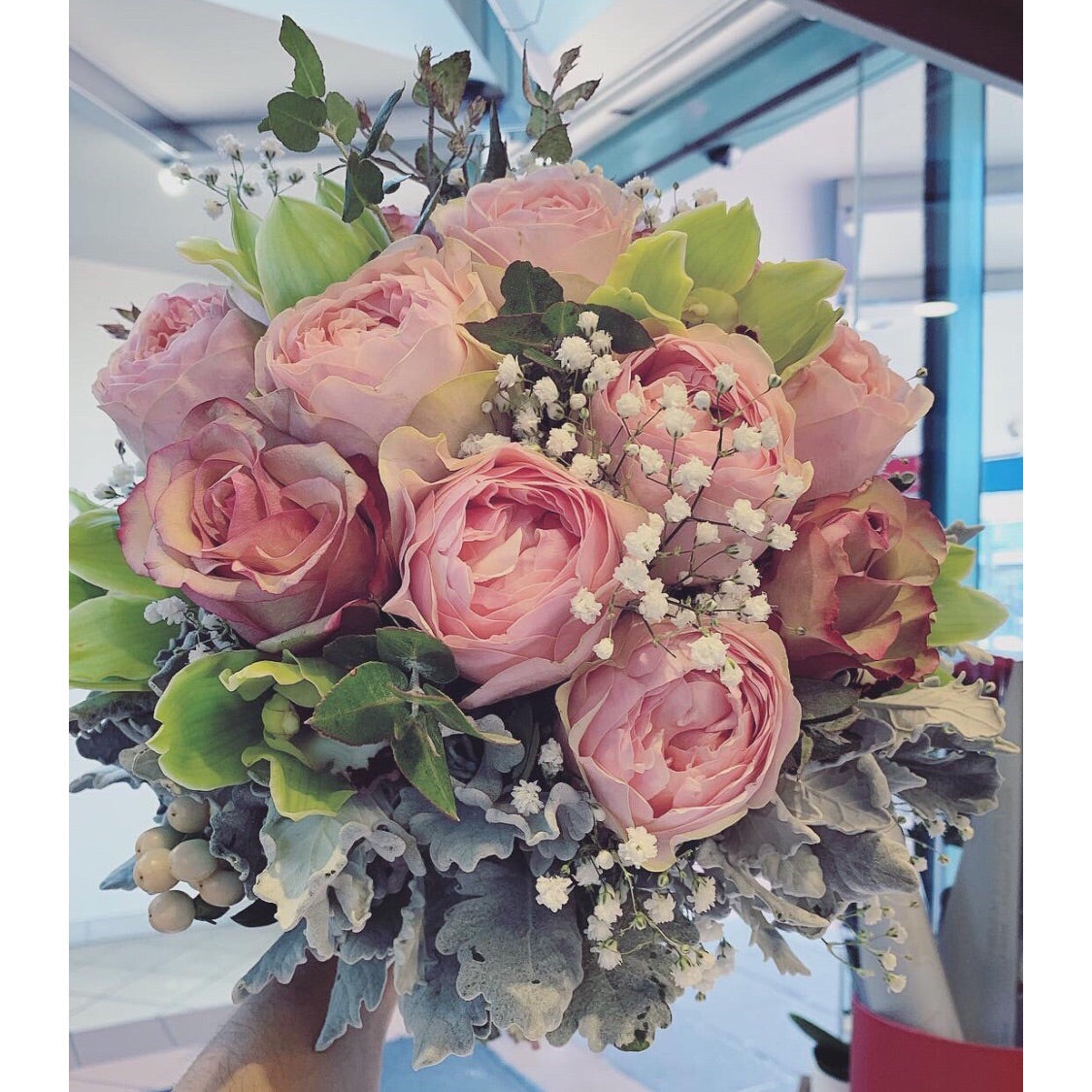 Bridal bouquet includes pink roses, green orchids, babybreaths, silver leaves and greenery.