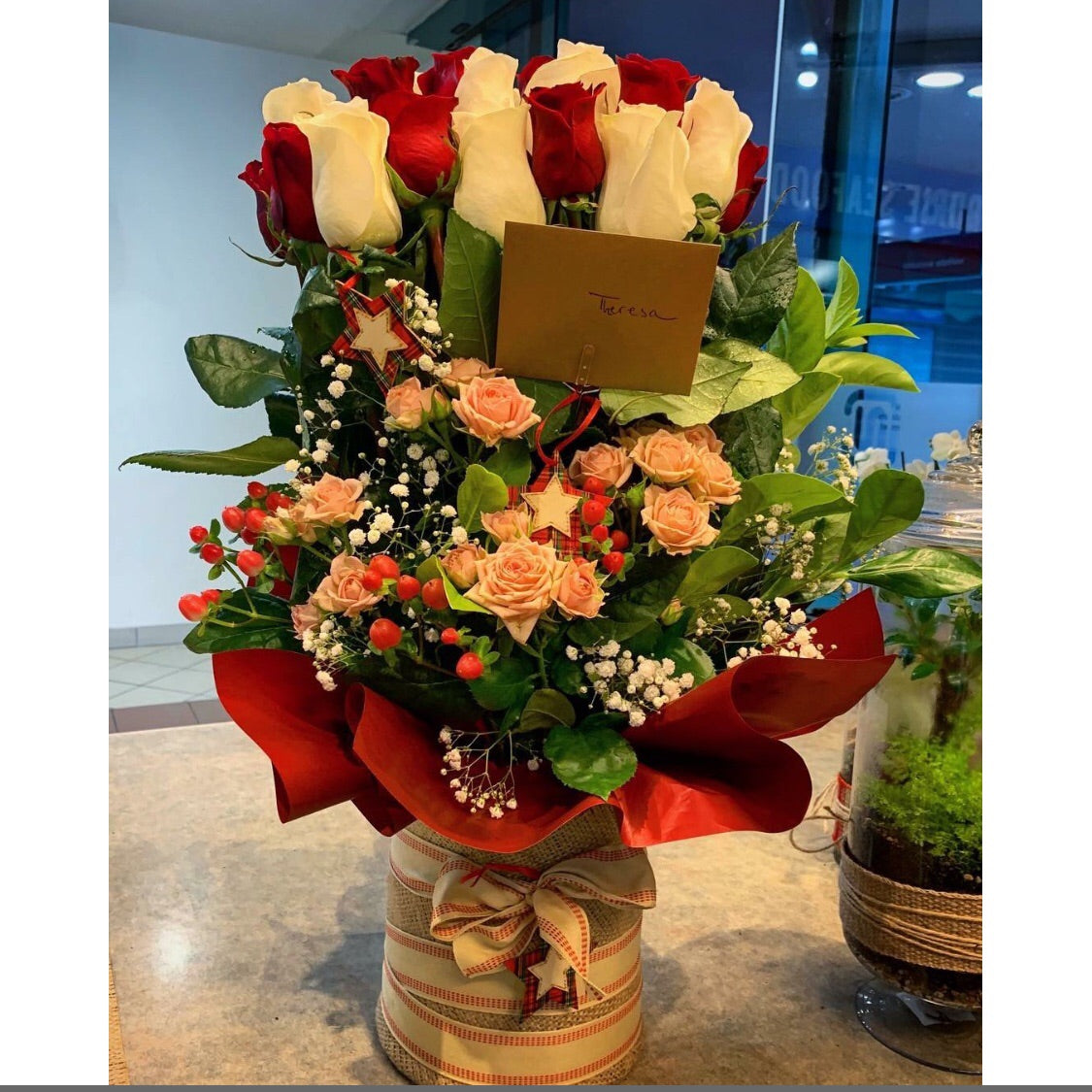 Red and white roses, spray roses and berries in box