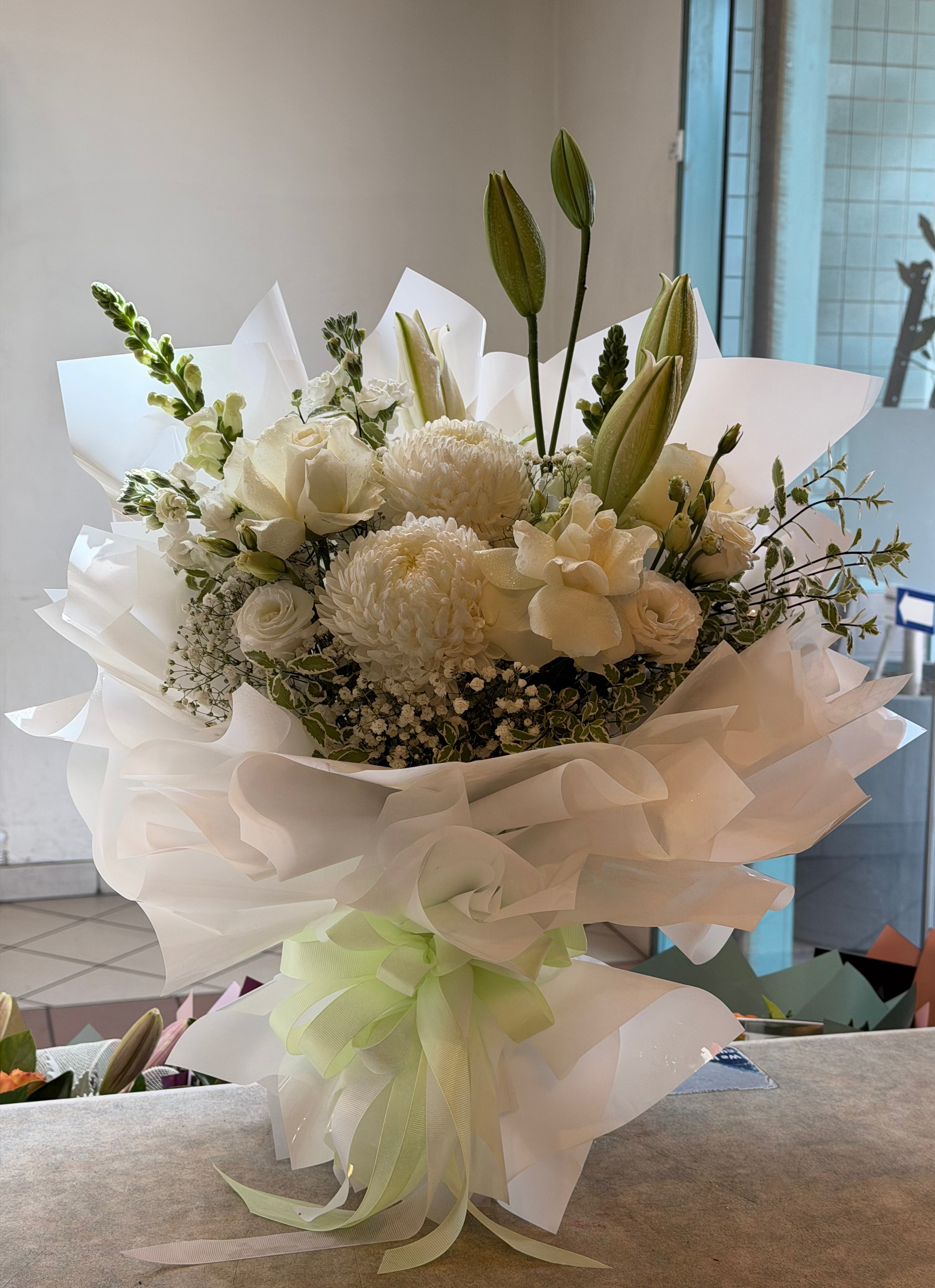 A fresh and stylish free-standing bouquet of green and white flowers, wrapped in pure white paper and tied with a delicate mint ribbon — perfect for any occasion.