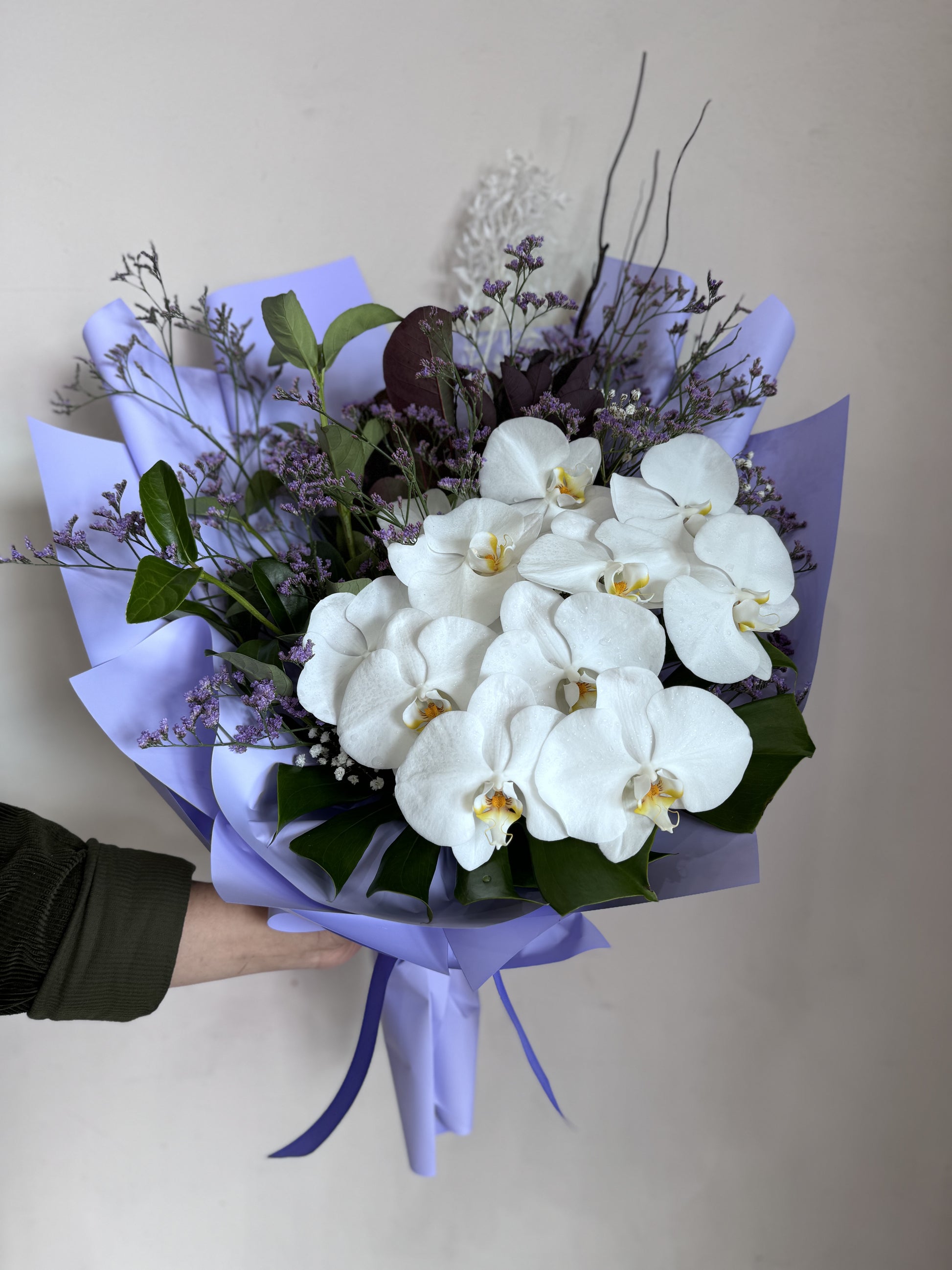 2 stems of phealanopsis orchids, greenery with our signature wrapping papers. Colors depends on availability on the day of delivery.