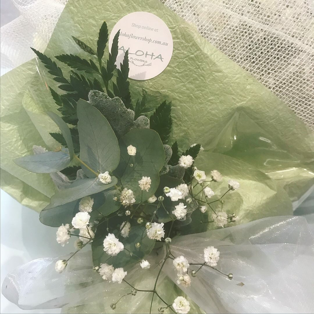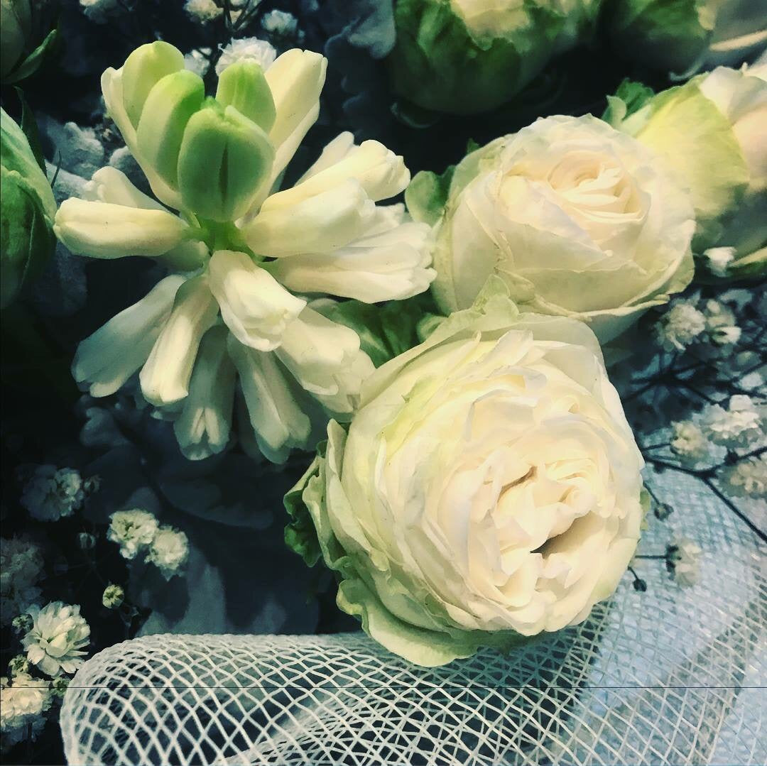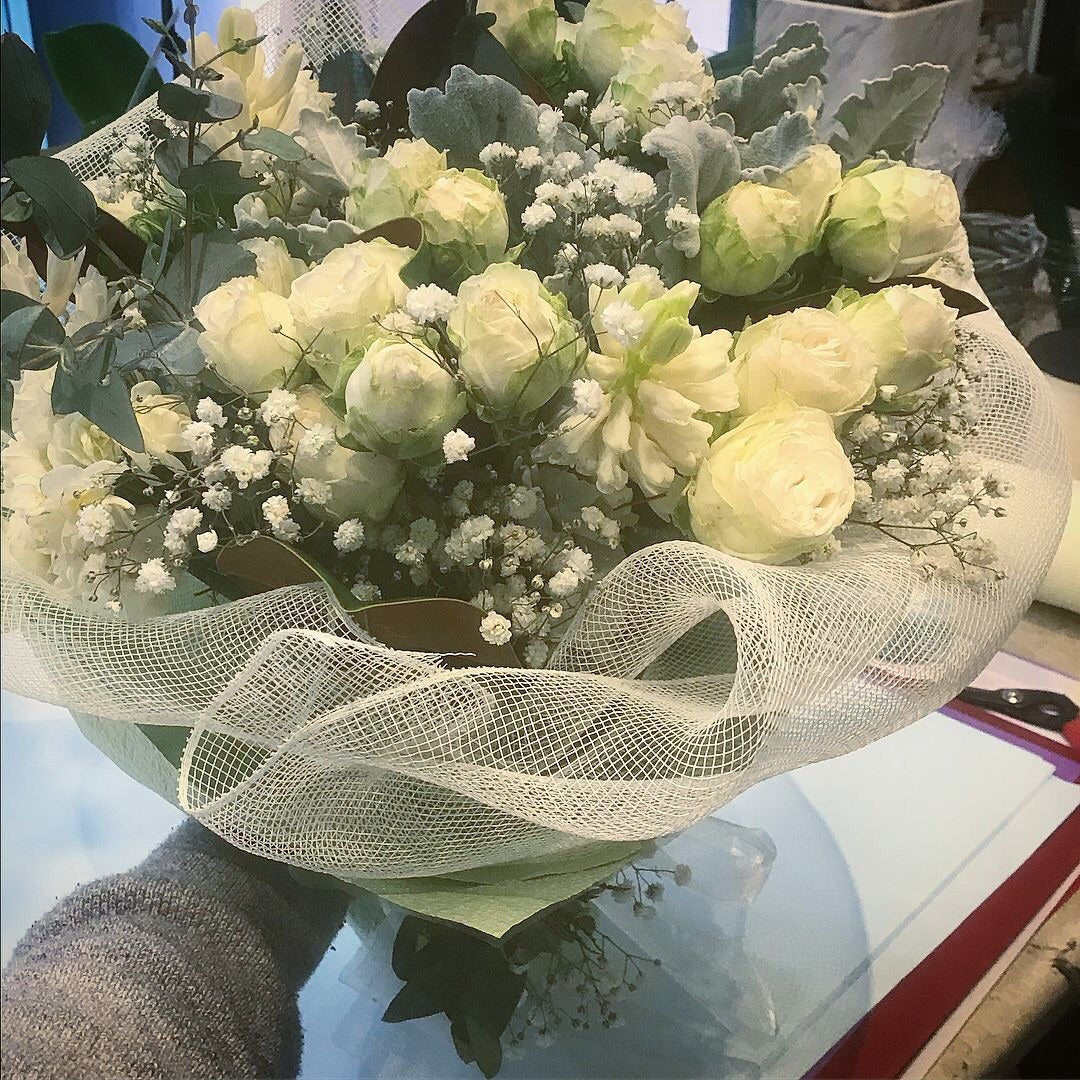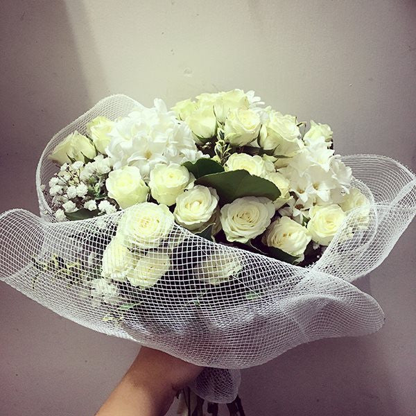 Hyacinth, spray roses and gypsophila in white mesh