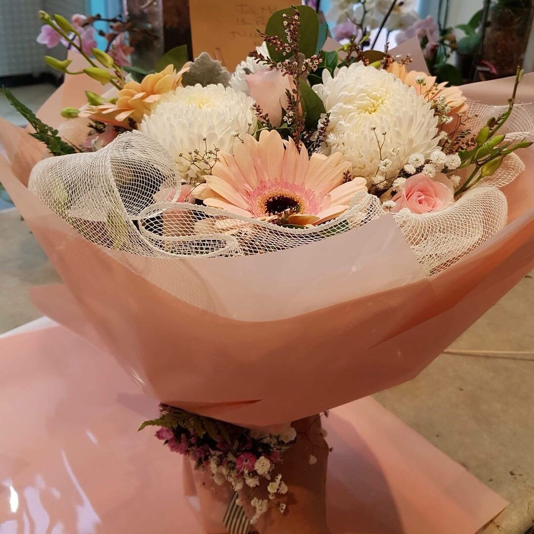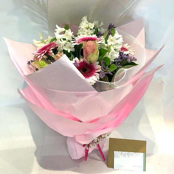 A mix of gerberas, hycinths, roses, misty in a bouquet with light pink wrapping paper and white mesh