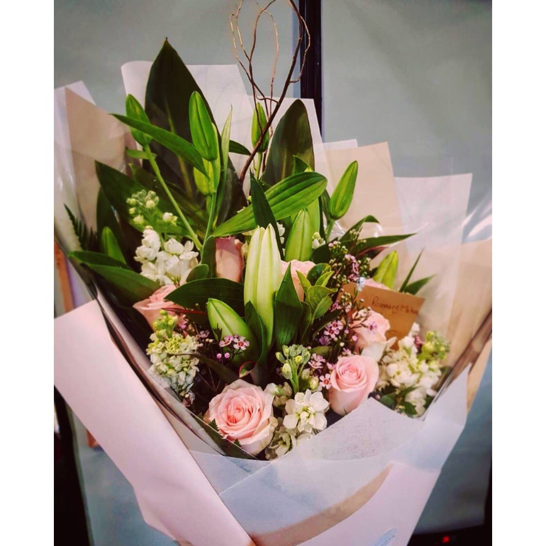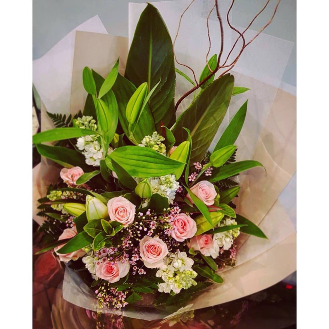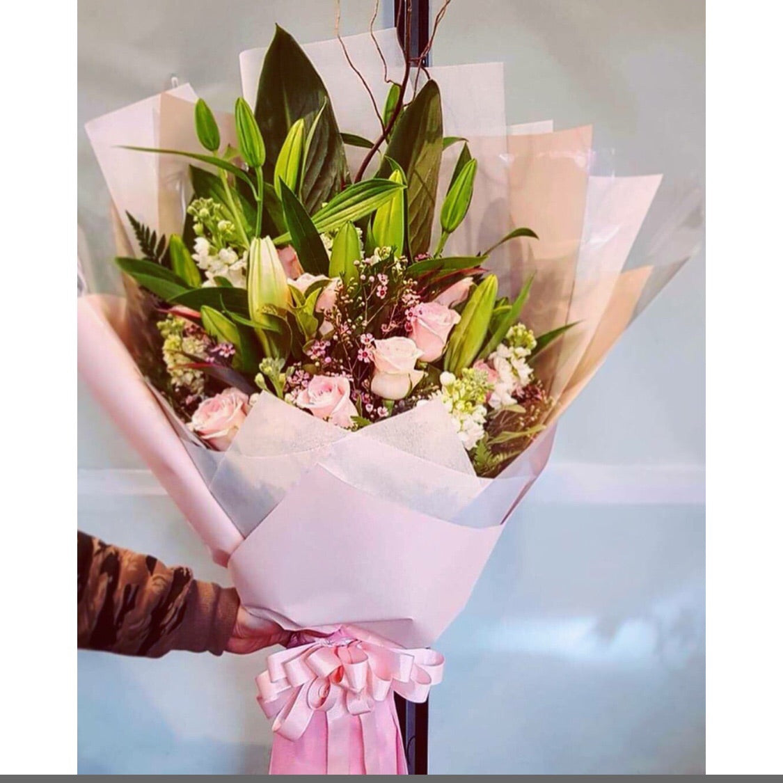 A mix of oriental lilies, roses, misty or wax in a bouquet with light pink wrapping paper and white mesh