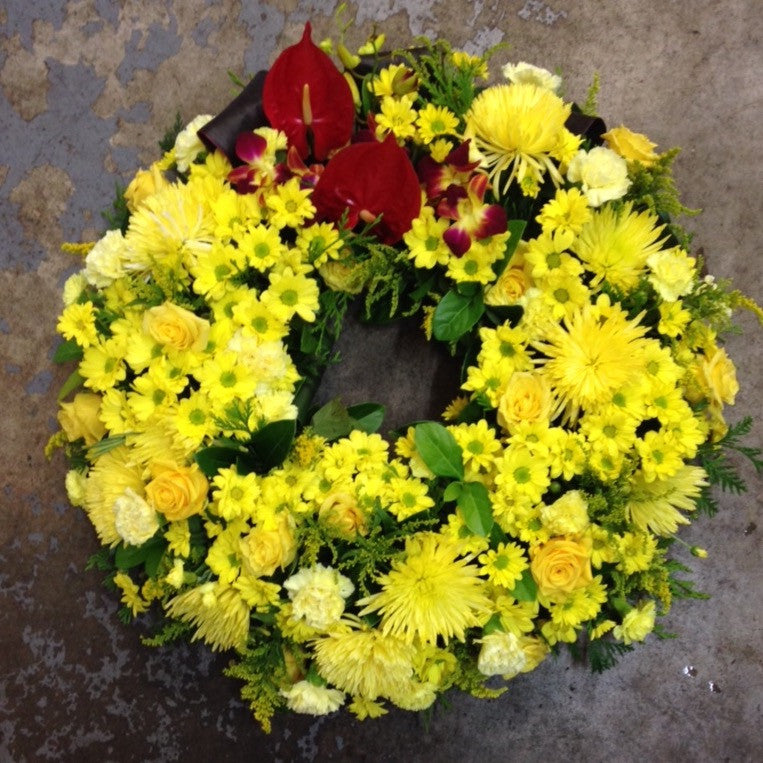 Yellow roses, chrysanthemums, disbuds and red anthuriums