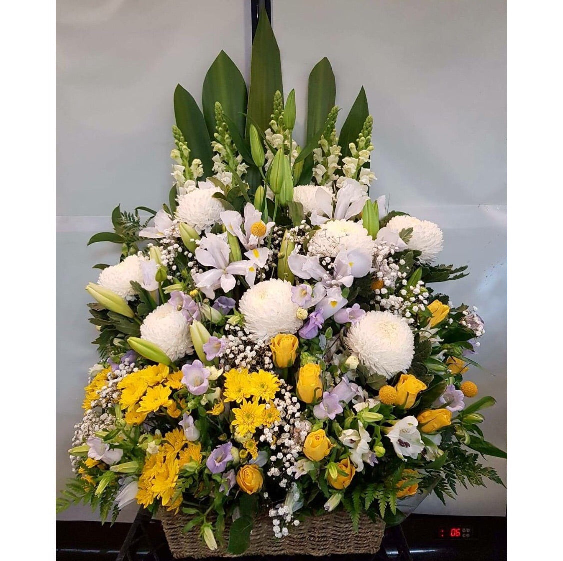 Snap dragons, oriental lilies, disbuds, yellow roses, irises, bell flowers, chrysanthemums and baby breath in vase