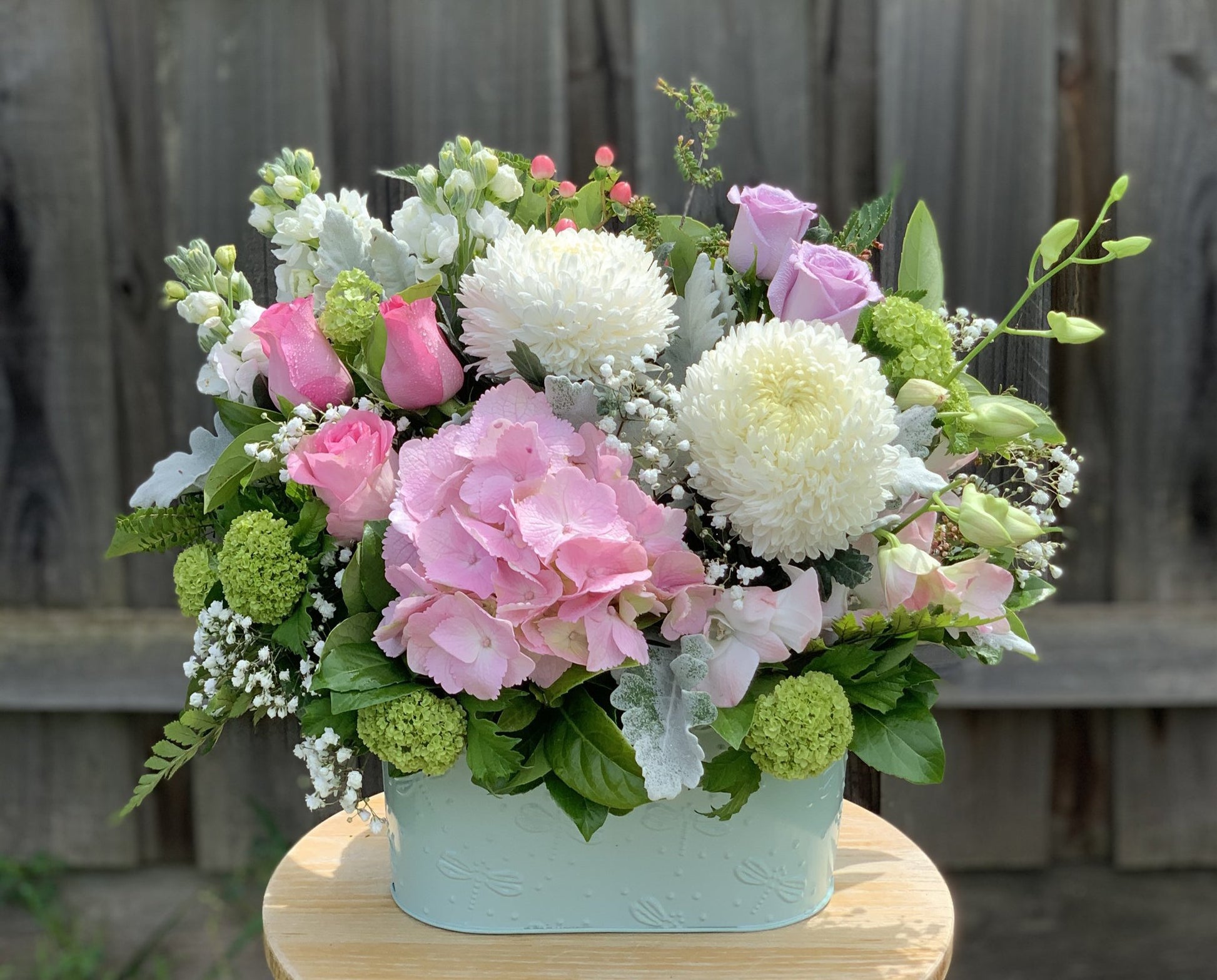 A mix of seasonal flowers in pastel tone, and green leave in a vintage tin, Available in Pale Pink, White or Light Green.