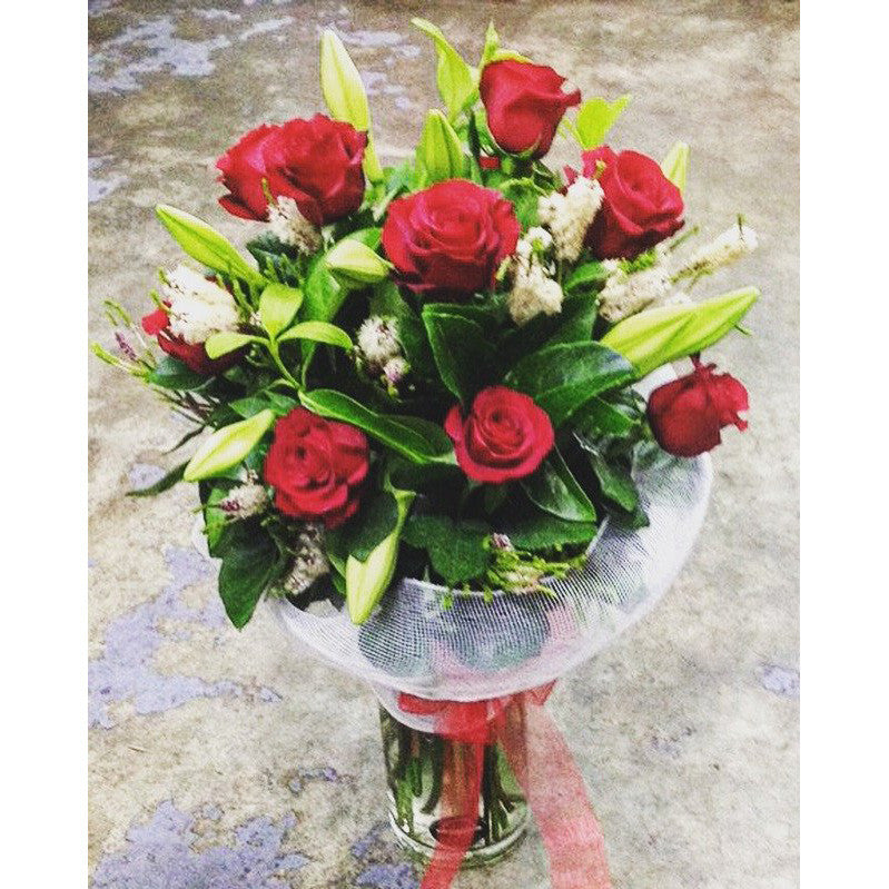 Red roses, berries and tiger lilies in a tall vase with mesh around for Valentine's Day