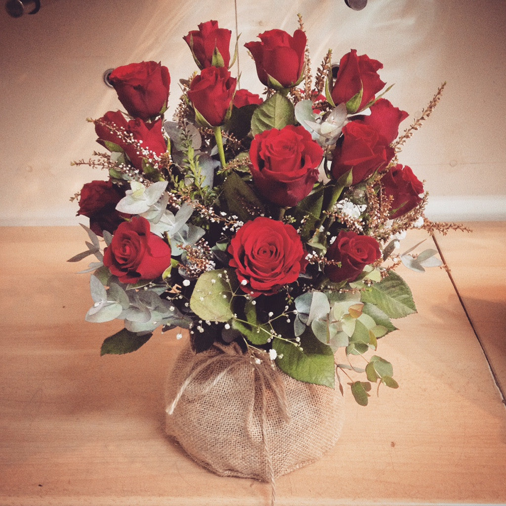 Red roses and baby breath with gum leave in signature black boxes for Valentine's Day