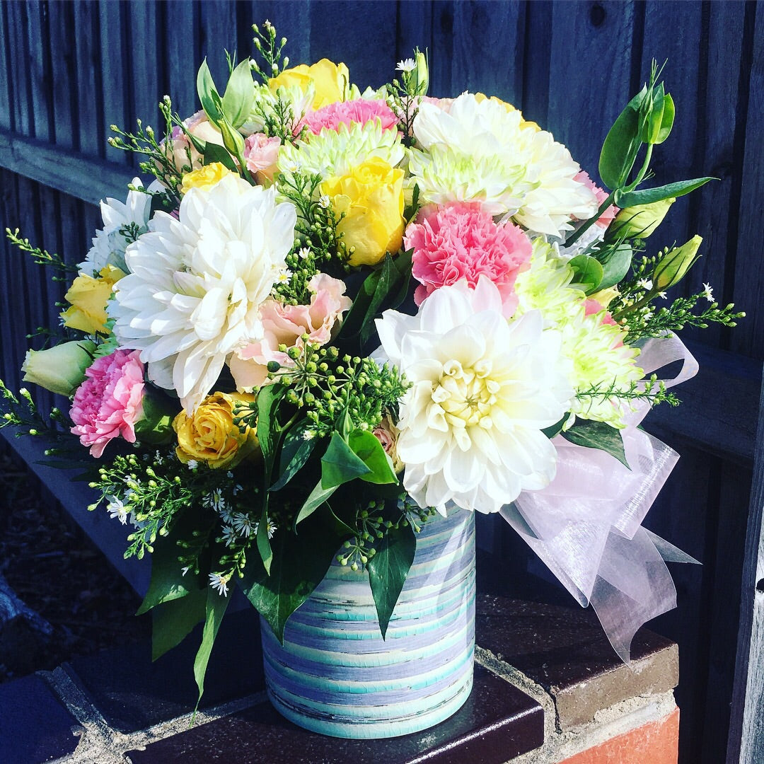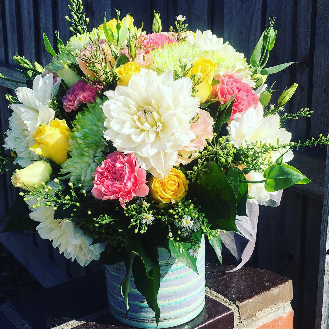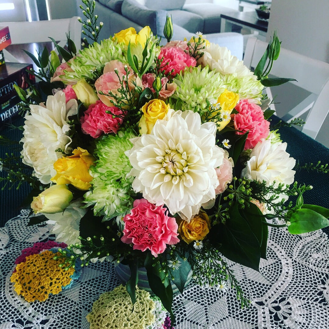 Pink carnations, white delias, green chrysanthemums and yellow roses